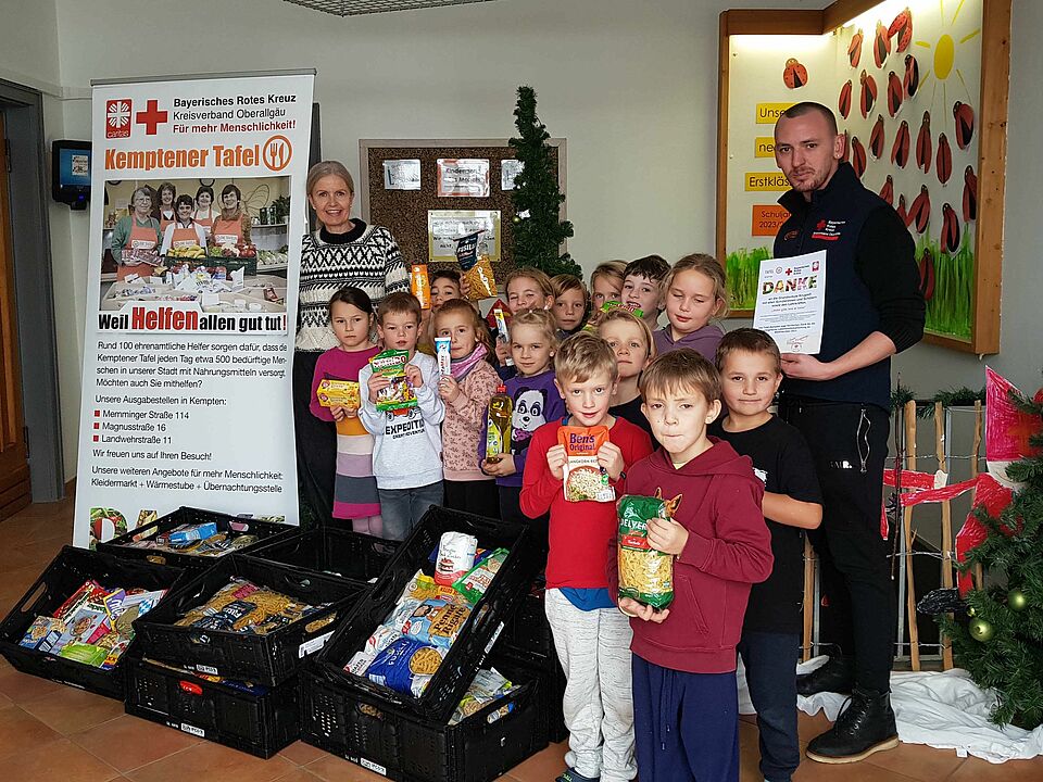Drei Wochen lang wurden an der Dorfgrundschule, die derzeit von 91 Kindern besucht wird, viele lang haltbare Lebensmittel und Hygieneartikel gesammelt. Was es mit der Tafel auf sich hat und warum ihre Spende wichtig ist, wurde den Schülerinnen und Schülern im Rahmen des Unterrichts von ihren Lehrerinnen und Lehrern gut erklärt. Was von den Menschen, die in den Tafelläden des BRK einkaufen können, am dringendsten gebraucht wird, konnten sie der exemplarischen Einkaufsliste der Tafel Kempten entnehmen. Darauf sind beispielsweise Nudeln, Reis, Mehl, Dauerwurst, Marmelade, Zucker, Speiseöl, Essig, Konserven, Tee, Kakao, Kaffee, Müsli, Waschmittel, Duschgel und Shampoo, aber auch kleine Leckereien wie Kekse, Schokolade und Bonbons sowie einiges mehr genannt.