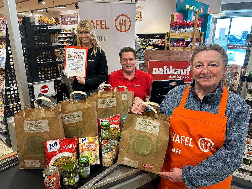 Die Mitarbeitenden des Nahkauf-Marktes N & G TANTE EMMA Retail Trade OHGhatten die Spendentüten im Vorfeld vorbereitet und diese mit Blick auf das bevorstehende Weihnachtsfest mit 500 Gramm Pasta, Basilikum-Pesto, Tomatensauce, Kartoffelknödel, Champignons aus der Dose sowie eingelegten Cornichons bestückt. Für fünf Euro konnten Kundinnen und Kunden eine solche Tüte erwerben und an die Tafel spenden. 145 Kundinnen und Kunden nutzten diese Möglichkeit, mit geringem Aufwand viel Gutes zu tun.
