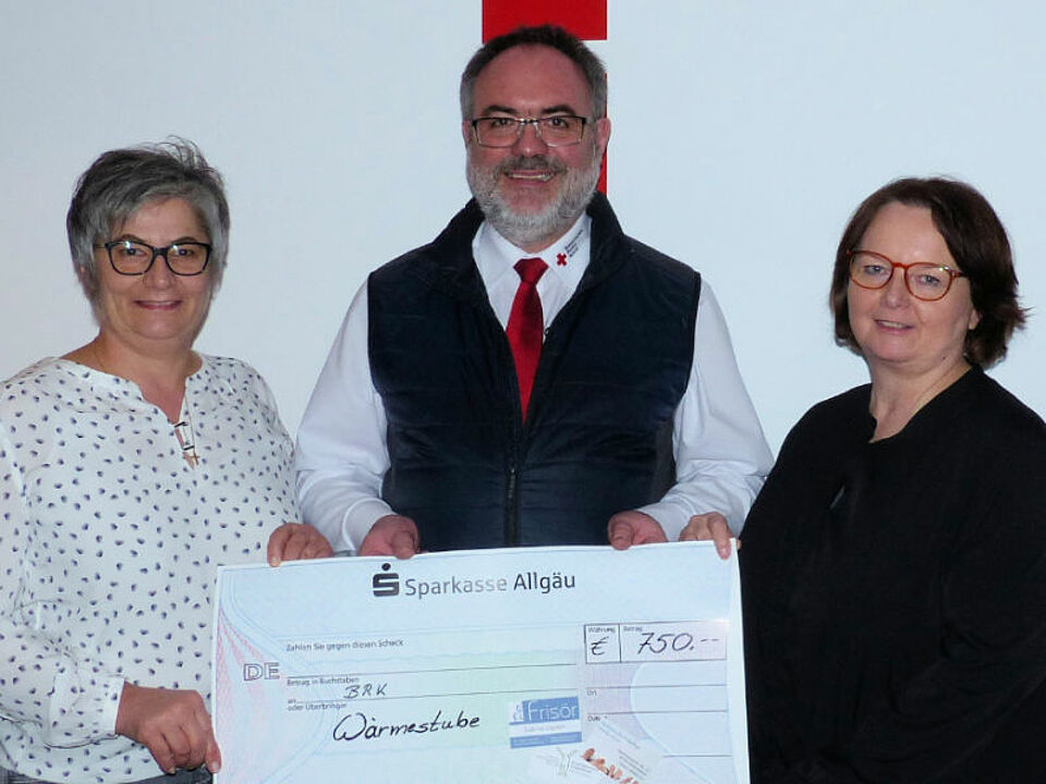 Unter dem Motto „Spenden statt Schenken“ hatten die drei Wildpoldsrieder Geschäftsfrauen Sabine Lagner (rechts im Bild), Claudia Mayer (links) und Anja Reichardt-Klarholz während der Adventszeit Spenden für die Wärmestube des Roten Kreuzes in Kempten gesammelt. „Kunden kamen sogar gezielt vorbei um Geld zu spenden“, beobachteten sie. Außerdem gab das Trio das übers Jahr gesammelte Trinkgeld in die Spendenbox und rundete den Betrag sodann auf 750 Euro auf. „Wir werden die Spende für die heuer geplante Renovierung der Wärmestube verwenden“, bedankte sich Kreisgeschäftsführer Alexander Schwägerl bei den Wohltäterinnen für ihr Engagement.