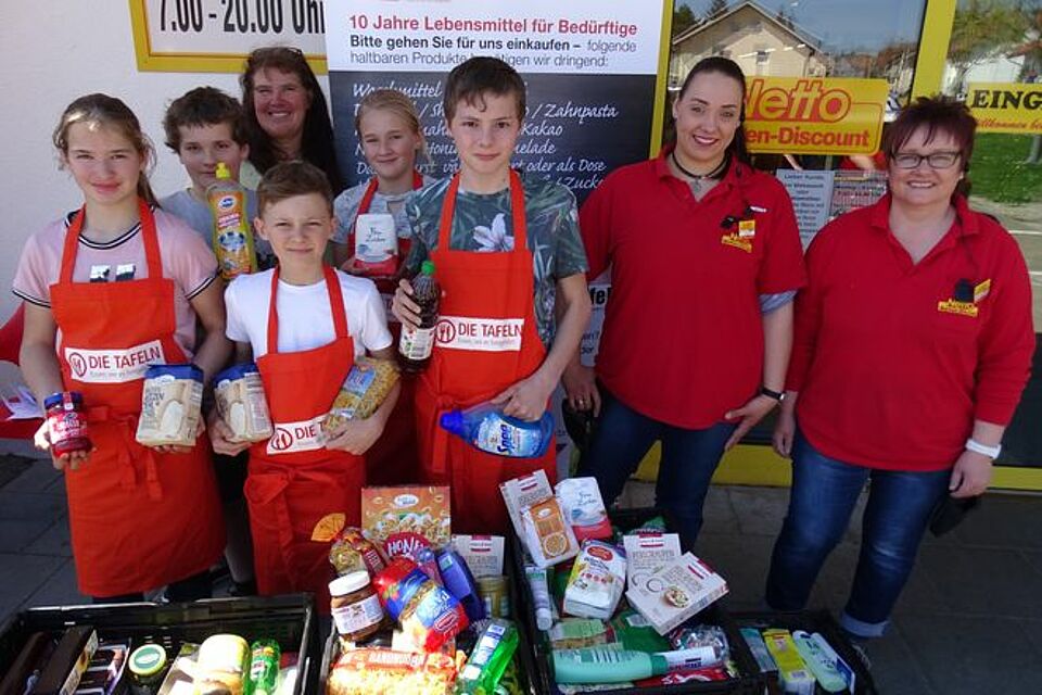 Natalie, Janik, Marcel, Annkatrin und Georg postierten sich am Eingang des Netto Marken-Discounts in Altusried und verteilten "Einkaufszettel" an die Kunden. Darauf zu finden waren unter anderem Konserven, Grundnahrungsmittel, Hygieneartikel und Waschmittel – Produkte, die die Tafel Kempten des BRK Oberallgäu regelmäßig benötigt.