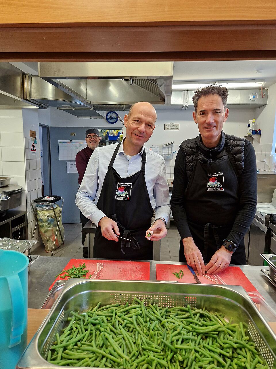 Vor wenigen Tagen verbrachten die drei Amtsträger wieder mehrere Stunden in der Küche der sozialen Einrichtung um, unterstützt durch die Hauswirtschafterin der Wärmestube, Alexandra Lingenhöl, gemeinsam ein köstliches Menü zuzubereiten. Zur Essenszeit halfen die drei Köche selbstverständlich auch beim Schöpfen der mehr als 100 Portionen mit. Die Besucherinnen und Besucher der Wärmestube durften sich über Schweinefilets mit Speckbohnen und selbstgemachten Spätzle sowie zum Nachtisch eine Quark-Sahnecreme mit Waldfrüchten und Spekulatius freuen. Das gesamte Essen wurde von der Stadt Kempten gespendet und kostenlos an die Gäste ausgegeben. Katrin Wassermann, die Leiterin der Wärmestube mit Übernachtungsstelle, berichtet: „Unsere Gäste waren sehr gut gelaunt und haben sich gefreut, dass das Essen kostenlos und, wie viele sagten, `sooooo lecker´ war. Sie sind auch etwas länger sitzen geblieben und haben sich mit den drei besonderen Köchen unterhalten. Die Aktion ist ein schönes Zeichen der Wertschätzung und Zuwendung für die Menschen in Kempten, denen es finanziell nicht so gut geht“, findet sie. „Für sie ist es schön zu erleben, dass der Oberbürgermeister und andere Persönlichkeiten sich ihrer ohne Berührungsängste annehmen und ihnen eine Freude bereiten möchten. Es war ein wirklich gelungener Nachmittag für alle Beteiligten.“
