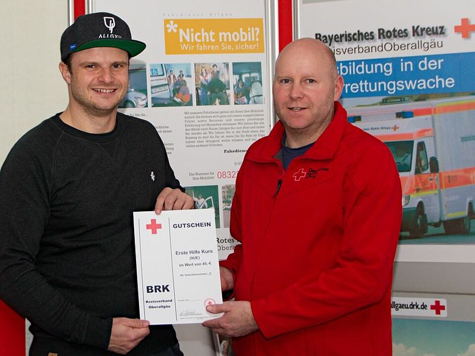 „So ein vorbildliches Verhalten ist leider nicht selbstverständlich“, erklärte Frank Schönmetzler, der beim BRK Oberallgäu für die Breitenausbildung zuständig ist. Er überreichte Bieber einen Gutschein für einen Erste Hilfe Kurs, in dem er seine Kenntnisse auffrischen kann, um auch in Zukunft in Notfällen das Richtige zu tun.