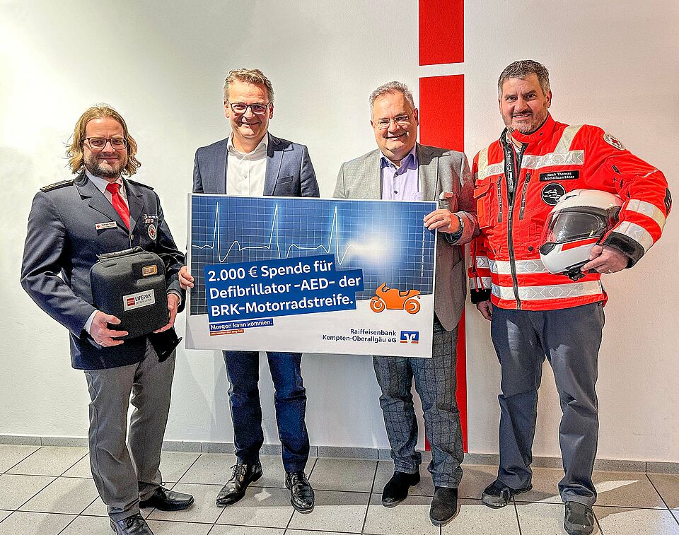 Die Raiffeisenbank Kempten-Oberallgäu unterstützt die Motorradstreife der BRK-Bereitschaften Oberallgäu mit einer Spende in Höhe von 2.000 Euro bei der Anschaffung eines Defibrillators. Somit können nun beide Dienstmotorräder des Fachdienstes Motorrad - so die offizielle Bezeichnung der Motorradstreife – mit diesem lebensrettenden Hilfsmittel ausgestattet werden.