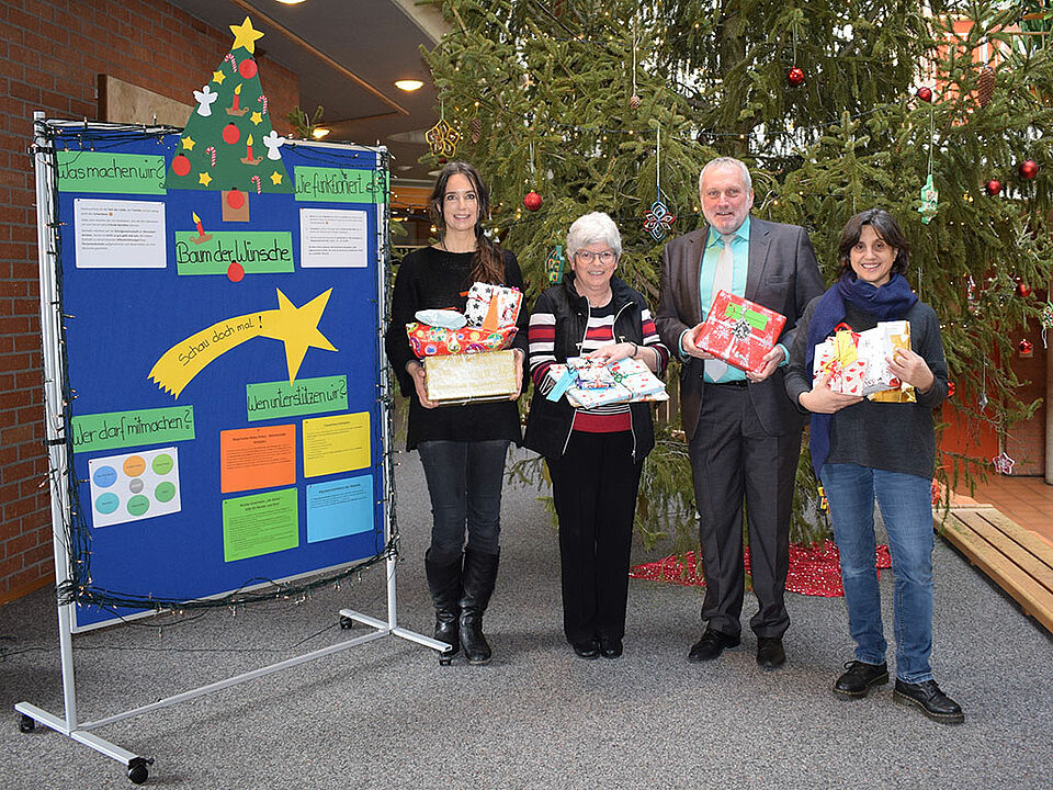 An ihm hingen Wünsche von Menschen, die niemanden haben, der sie ihnen erfüllen kann. Hierzu wurde im Voraus Kontakt zu verschiedenen Hilfseinrichtungen bzw. Personenkreisen aufgenommen. Dies waren das Frauenhaus in Kempten, die Wärmestube des Bayerischen Roten Kreuzes, das Mutter-Kind-Heim „Die Barke“ sowie die Migrationsfachdienste der Diakonie in Kempten. Nachdem die Wünsche eingegangen waren, konnte sich jeder einen Wunsch vom Baum nehmen, das entsprechende Geschenk kaufen und im Sekretariat der Schule abgeben.
