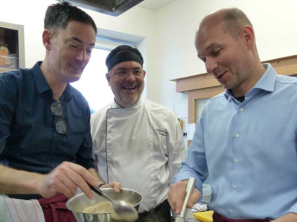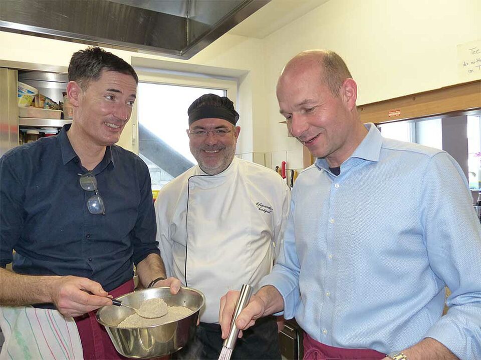 OB Kiechle, Sozialreferent Baier-Regnéry und BRK-Kreisgeschäftsführer Schwägerl kochen in der Wärmestube