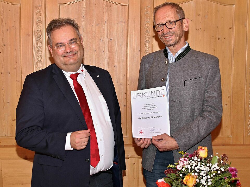 Dr. med. Andreas Baumgarten war 20 Jahre lang – von 2001 bis 2021 – als stellvertretender Chefarzt und später als Chefarzt Mitglied im Vorstand des Bayerischen Roten Kreuzes (BRK) im Kreisverband Oberallgäu. Er war damit das langjährigste Mitglied des Gremiums. 2021 trat der 66-Jährige gebürtige Münchner, der seit mehr als drei Jahrzehnten im Allgäu fest verwurzelt ist, auf eigenen Wunsch nicht mehr zur Wiederwahl an. Nun wurde der Mediziner für sein außerordentliches Engagement mit der Silbernen Ehrennadel des BRK ausgezeichnet.