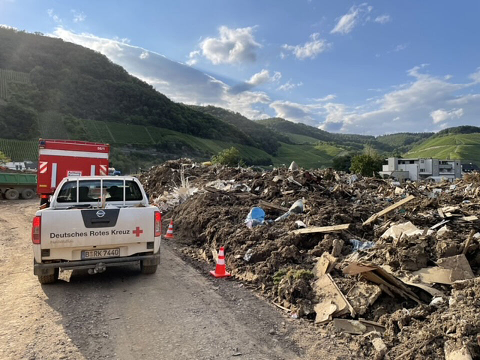 Julia Rebuck, die den Fachdienst Psychosoziale Notfallversorgung (PSNV) der BRK-Bereitschaften im Oberallgäu sowie den Arbeitskreis Krisenintervention leitet, war zusammen mit einer Kollegin und einem Kollegen aus dem Kriseninterventionsdienst vier Tage lang im Landkreis Ahrweiler im Einsatz. Eine Woche später reisten 15 ehrenamtliche Kräfte verschiedener Bereitschaften des BRK Oberallgäu als Teil des Hilfeleistungskontingents Schwaben ins Katastrophengebiet, darunter Sebastian Stadler von der BRK Bereitschaft Kempten. Er erzählt: „Als wir im Katastrophengebiet ankamen, waren schon fast zwei Wochen seit der Flutkatastrophe vergangen. Trotzdem waren die Zustände noch schlimm. Man kann sich kaum vorstellen, wie verheerend es anfangs dort ausgesehen haben muss. In unserem Einsatzgebiet waren viele Gebäude komplett zerstört, bei anderen war vom Keller bis zum 1. Obergeschoss alles unbewohnbar.“ Zigtausende Menschen hätten in den Fluten alles verloren: Haus, Auto, Papiere, Mobiliar, in besonders tragischen Fällen sogar Angehörige oder Freunde. „Einheimische und Helfer sind seit Wochen ununterbrochen dabei, die Schäden zu beseitigen, Schlamm und alles, was sich darin befindet, aus den Häusern zu schaufeln, marode Mauern herauszureißen. Die Trümmer werden auf riesigen provisorischen Halden außerhalb der Orte gelagert, von wo sie dann, wohin auch immer, abtransportiert werden.“ Was sofort auffalle, sei der Geruch nach Fäulnis, nassem Unrat und Diesel, der über allem liege und sich in Haaren und Kleidung einniste. „Der hat mich bis ins Allgäu zurück verfolgt.“