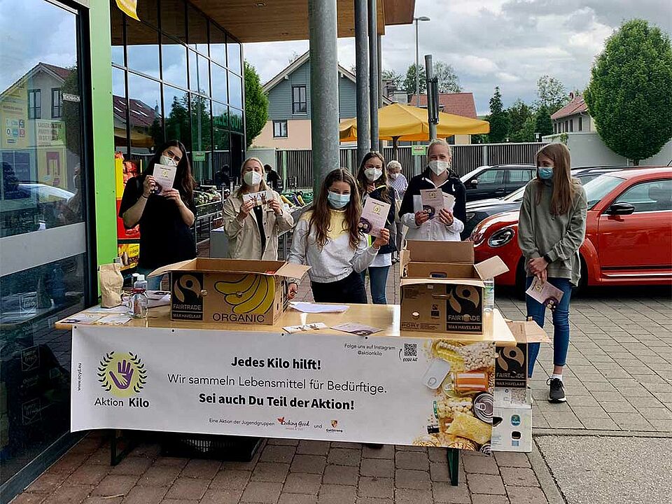 Die engagierten Mädchen des Looking Good Teams Allgäu und ihre sechs Gruppenleiterinnen hatten am ersten Juniwochenende vor vier Supermärkten in der Region Stände aufgebaut. Sie ließen sich auch vom Regen die gute Laune und die Freude am Helfen nicht verderben. Die Mädchen baten die Einkaufenden, ein Kilo mehr an haltbaren Lebensmitteln zu kaufen und für Bedürftige zu spenden. Flyer und Banner erläuterten die Aktion.