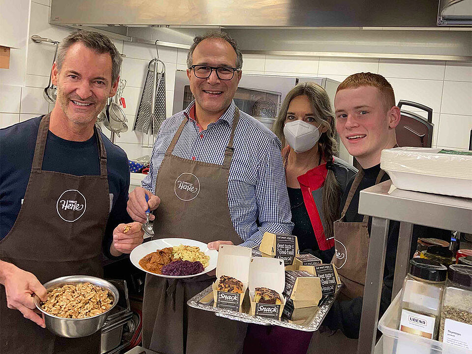 Da ein gemeinsames Essen in den Räumlichkeiten der Wärmestube aufgrund der Pandemielage leider auch in diesem Jahr nicht möglich war, wurden die Speisen zum einen vor dem Eingang der Wärmestube zum Mitnehmen ausgegeben, zum anderen mit dem mobilen Food-Trailer der Wärmestube zu den Obdachlosenunterkünften in der Reinhartserstraße 2 und am Schumacherring 123 gebracht. „Christian Henze und Alexander Hold kamen mit zu den Unterkünften und gaben auch dort das selbst gekochte Essen aus. Sie waren von der Situation der Gäste und der Bewohner in den Obdachlosenunterkünften sehr berührt und sagten uns weitere Hilfe und Unterstützung zu.“