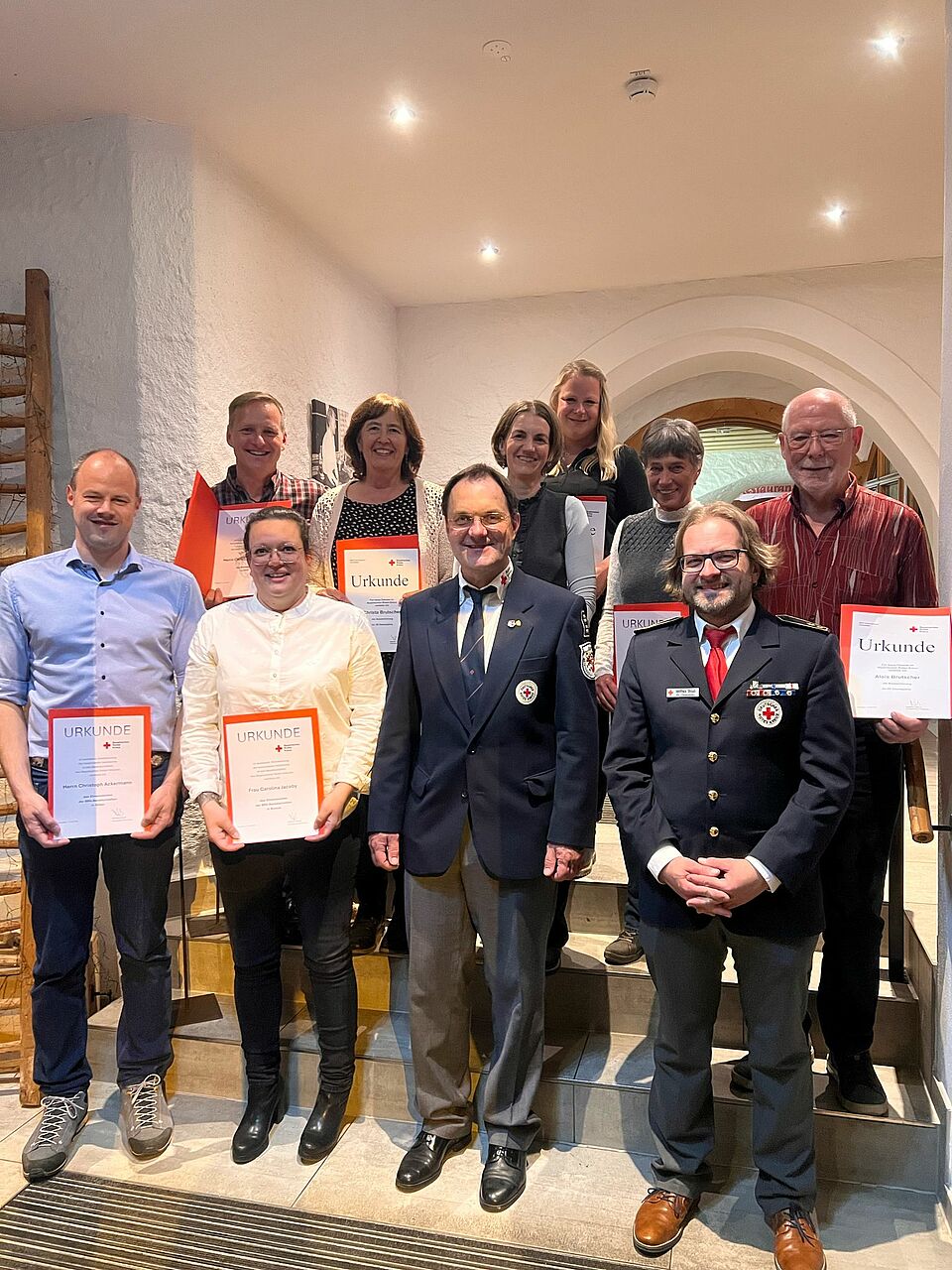 Auch die örtliche Jugendrotkreuzgruppe war wieder sehr engagiert. Sieben Gruppenleiterinnen und -leiter bereiteten den Kindern und Jugendlichen in den Altersgruppen von 6 bis 9 Jahren und von 10 bis 15 Jahren ein spannendes Jahr, mit monatlichen Gruppenstunden, Wettbewerben, Ausflügen und sozialen Projekten. Weitere Aktivitäten der Oberstdorfer Bereitschaft umfassten Seniorennachmittage, Blutspendetermine, einen Stand auf dem Weihnachtsmarkt, Veranstaltungen zur Mittelbeschaffung, sowie Einsätze der Fahnenabordnung. Letztere musste leider die langjährige Bereitschaftsleiterin, ein Urgestein des Roten Kreuzes Oberstdorf und eines seiner aktivsten Mitglieder, zu Grabe geleiten. Damit die Helferinnen und Helfer für ihre vielfältigen Aufgaben gut gerüstet sind, wurden insgesamt 12 Übungsabende durchgeführt. Zusätzlich absolvierten mehrere Mitglieder anspruchsvolle Aus- und Weiterbildungen. So qualifizierte sich etwa Judith Neumann zur Rettungssanitäterin und Patrick Staiger zum Einsatzleiter Rettungsdienst. Anton Kappeler dankte allen Mitgliedern herzlich für Ihren unermüdlichen Einsatz zum Wohle der Allgemeinheit.