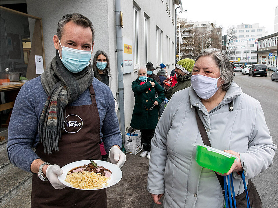 „Die Veranstaltung, die heuer ins zehnte Jahr geht, soll für die Gäste der Wärmestube, welche ja finanziell und manchmal auch gesundheitlich stark eingeschränkt sind, eine Form der Teilhabe sein und ihnen Freude bereiten“, erklärt die Leiterin der Wärmestube, Amelie Lang. Sie betont: „Das Ganze ist keine Konkurrenzveranstaltung zu unseren guten und engagierten Köchinnen und Köchen, die im Alltag die Mittagsmahlzeiten für unser Besucher zubereiten. Vielmehr ist sie als eine ungewöhnliche, durchaus exklusive Form der Wertschätzung vonseiten der Menschen Christian Henze und Alexander Hold zu verstehen, die ihre Leidenschaft für gute Küche aus ganzem Herzen mit einem besonderen Publikum teilen möchten.“ Nachdem Christian Henze sein Werk in der Küche vollendet hatte, beteiligte er sich auch an der Essensaugabe, die derzeit Corona-bedingt vor der Tür der Wärmestube stattfinden muss. „Dabei wurde er sogar um Autogramme gebeten. Besonders die Frauen, aber auch die Männer waren sehr angetan von ihm“, schmunzelt Amelie Lang.