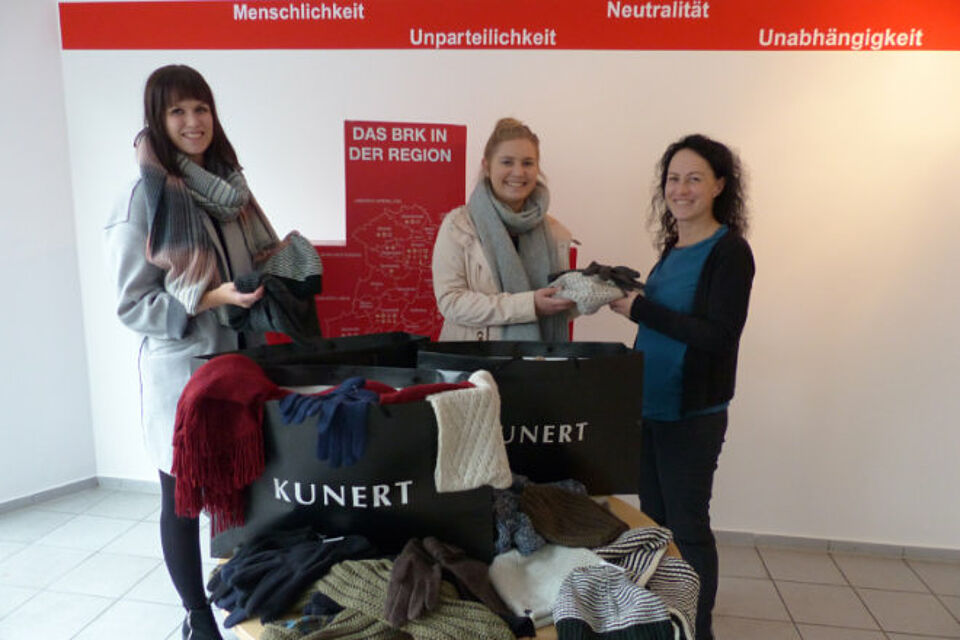 Gerade jetzt in der kalten Jahreszeit, sind Schals, Mützen und andere wärmende Kleidungsstücke sehr gefragt und wurden in den Kleiderläden langsam rar. Gerade rechtzeitig überraschten Luisa Schwarzbach und Anna Sattler von der Firma Kunert aus Immenstadt Daniela Raiger, Leiterin der Rotkreuzläden, mit einer großzügigen Kleiderspende. Neben Ponchos fanden sich ausreichend Handschuhe, Mützen und Schals, die umgehend an die Kleiderläden verteilt und dort zum günstigen Preis angeboten werden. Wir bedanken uns herzlich bei der Firma Kunert für die Spende, die genau zum richtigen Zeitpunkt kam!