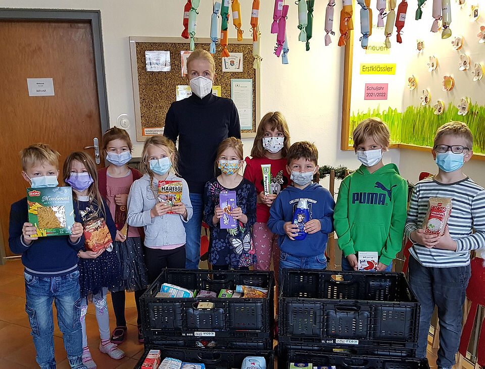 Michaela Arndt, die Schulleiterin der Grundschule Krugzell, mit einigen Schülerinnen und Schülern und den gespendeten Lebensmitteln.