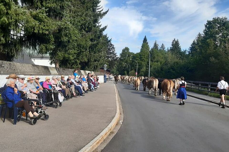 Viehscheid in Schöllang, für die Bewohner des Hauses der Senioren in Oberstdorf eine schöne Tradition. Schon seit 15 Jahre nutzen die Senioren der BRK-Einrichtung die gute Lage in der Holzerstrasse 17 und schauen bei der Rückkehr der Tiere und Hirten der Alpen Käseralp, Gutenalp und Seealpe auf ihrem Weg zum Scheidplatz in Schöllang zu.