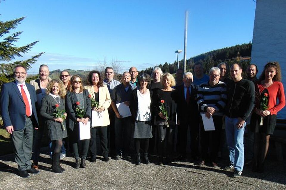 Bei strahlendem Sonnenschein begrüßte Alfred Reichert, Vorsitzender des BRK Oberallgäu, die diesjährigen Arbeitsjubilare des Kreisverbands im Berggasthof Kranzegg.