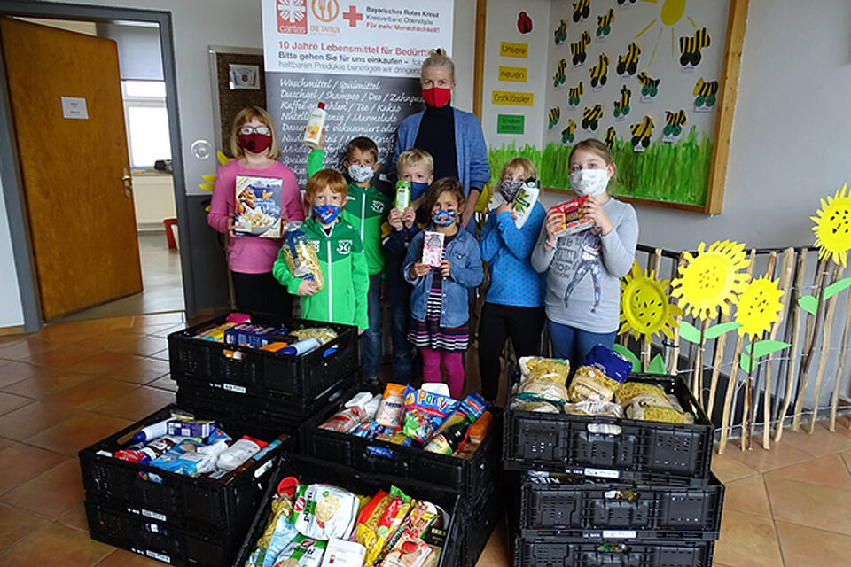 Rektorin Michaela Arndt sammelte zusammen mit den 72 Schülerinnen und Schülern und mit Unterstützung von deren Eltern und Großeltern Lebensmittel und Hygieneartikel für die Tafel Kempten. Dank eines Informationsblattes wussten alle ganz genau, welche Dinge dringend benötigt werden. Dazu gehören beispielsweise Wasch- und Spülmittel, Duschgel, Shampoo und Zahnpasta, Kaffee, Tee und Kakao, Nutella, Honig und Marmelade, Dauerwurst, Nudeln, Reis, Mehl und Zucker, Müsli, Essig und Öl oder auch Süßigkeiten. Im Lauf von zwei Wochen trugen die Kinder mehr als 350 einzelne Artikel zusammen. Markus Wille vom BRK, der die Tafel Kempten koordiniert, nahm die Spenden in Empfang und dankte allen großen und kleinen Beteiligten sehr herzlich für ihre Hilfsbereitschaft.