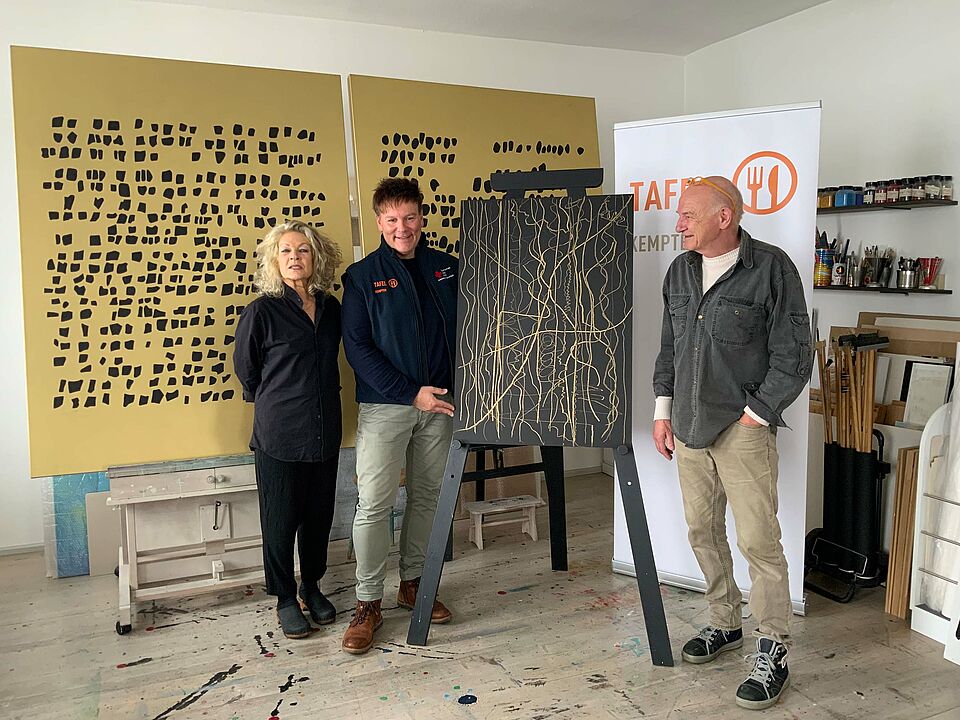 Vom dem fertigen Bild der Kunstaktion wurden anschließend Drucke angefertigt, die gegen eine Spende zugunsten der Tafel Kempten erworben werden konnten. Da auch die Münchener Druckerei „Pure FineArt“ auf ihre Erlöse verzichtete und die Künstler selbst zusätzlich 100 Euro spendeten, konnte BRK-Tafel-Koordinator Markus Wille am vergangenen Montag im Atelier der Beiden eine Spende von 750 Euro entgegennehmen. Das ebenfalls überreichte Originalbild ziert zukünftig den Gastraum der BRK-Wärmestube in Kempten, als ein Zeichen der Solidarität von mehr als 30 Ausstellungsbesuchern.