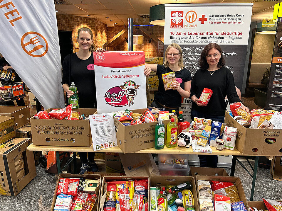 Der Ladies' Circle Kempten führte vor wenigen Tagen erneut eine Spendensammlung zugunsten der Tafel Kempten durch. Sechs Mitglieder des Service-Clubs baten vor dem Eingang des V-Markt Kempten Kundinnen und Kunden darum, ihren Einkauf um ein paar ausgewählte Dinge zu erweitern und diese danach am Spendenstand abzugeben.