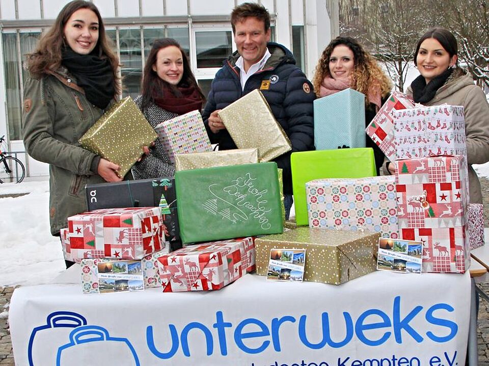 Über einen ganzen Tisch voll weihnachtlich verpackter Pakete konnte sich Tafel-Koordinator Markus Wille vom Bayerischen Roten Kreuz Oberallgäu freuen. Mit der „Schuhbox-Aktion“ hatte der Verein „unterweks“, ein Zusammenschluss von Tourismusstudentinnen der Hochschule Kempten, bereits zum fünften Mal in Folge Pakete für die Tafel Kempten gesammelt. Unter Federführung der zweiten Vorsitzenden Tonja Schühle hatten die Studentinnen kräftig die Werbetrommel gerührt und ihre Kommilitonen dazu aufgerufen, Lebensmittelpakete für den guten Zweck zu packen. „Um auf die Aktion aufmerksam zu machen, verkauften wir an drei Aktionstagen Glühwein vor der Mensa der FH Kempten“, so Schühle. Außerdem verbreiteten sie den Aufruf über die Netzwerke Instagram und Facebook im Internet. Neben haltbaren Lebensmitteln und Süßigkeiten brachten die Spenderinnen auch Hygieneartikel und Spielzeug mit. Rechtzeitig zu den Festtagen durften sich dann Bedürftige aus der Region über den Inhalt der bunten Päckchen freuen: In der Woche vor Weihnachten verteilten Ehrenamtliche des BRK Oberallgäu die Pakete an Tafel-Kunden in St. Mang.