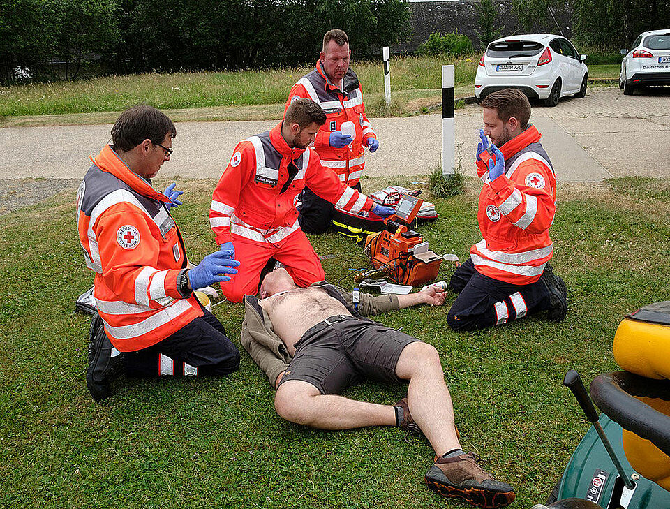 - bei Bewusstlosigkeit und fehlender normaler Atmung: Herz-Lungen-Wiederbelebung (im Wechsel 30x2)