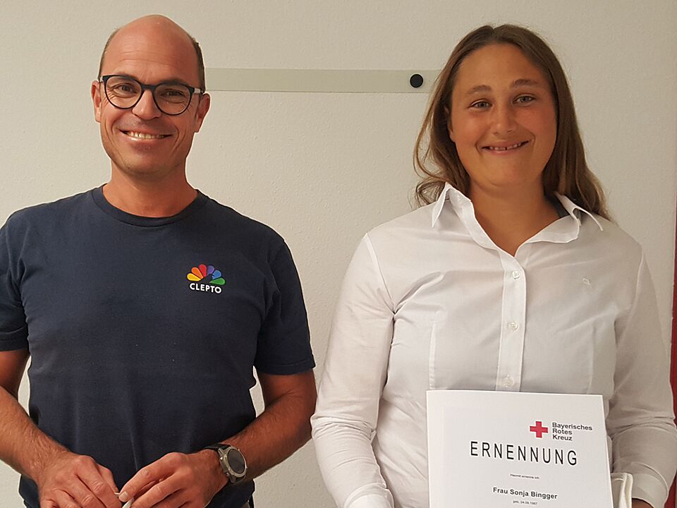 Matthias Straub und Sonja Bingger freuen sich über diesen Erfolg. „Die Online-Schulung hat sehr viele Vorteile“, sagen die beiden. „Die Präsenzzeit reduziert sich um ein Drittel und zudem fallen keine Fahrt-, Übernachtungs-, Verpflegungs- oder Dozentenkosten an. Sehr gut und hilfreich ist auch, dass die Teilnehmenden sich ihre Lernzeit frei einteilen können. Jeder kann in seinem individuellen Tempo lernen, die einzelnen Module jederzeit unterbrechen und später nahtlos fortsetzen oder bei Bedarf auch beliebig oft wiederholen.“ Die ersten Kurse seien gut gelaufen, bestätigt Sonja Bingger. Sie wurde vor wenigen Tagen offiziell zur ehrenamtlichen (noch kommissarischen) „Instruktorin Sanitätsdienstausbildung“ beim BRK Oberallgäu ernannt. Der stellvertretende Chefarzt des BRK Oberallgäu, Dr. Florian Hilger nahm die Ernennung während der Sitzung des „Arbeitskreis Ehrenamt“ vor. Nichtsdestotrotz wird das BRK Oberallgäu, nach Möglichkeit im Jahr 2022, auch einen Grundlehrgang Sanitätsdienst in kompletter Präsenz anbieten, um alle Interessenten abholen zu können.