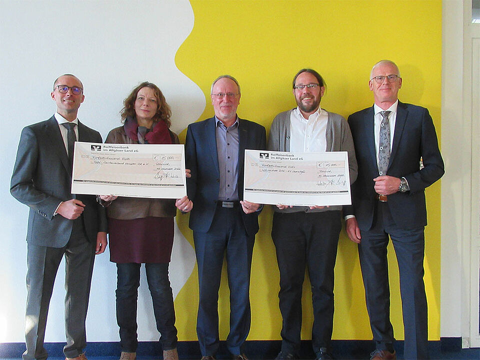 Vorstand und Aufsichtsratsvorsitzender der Raiffeisenbank im Allgäuer Land eG übergaben jüngst eine Spende in Höhe von 15.000 Euro zu Gunsten der Wärmestube mit Übernachtungsstelle Kempten an das BRK im Kreisverband Oberallgäu. Im selben Rahmen erhielt auch der Tafelladen der Caritas Kempten eine Zuwendung in Höhe von 15.000 Euro.