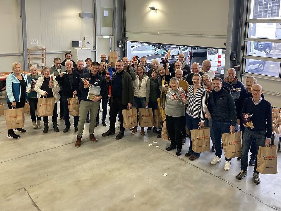 Am Samstagvormittag herrschte emsiges Treiben in der Halle des Kemptener Busunternehmens Haslach. Knapp 40 Mitglieder des Rotary Club Kempten-Residenz packten dort 350 Überraschungstüten. Sie füllten diese mit verschiedenen Produkten des täglichen Lebens, wie beispielsweise Dauerwurst, Salatöl, Konserven, Konfitüre oder auch Duschgel und Shampoo und vielem mehr. Ein Päckchen Kekse und Erdnüsse sollen den Empfängern einen Hauch von Adventszeit nach Hause bringen. Die Tüten wurden dann zu den drei Ausgabestellen der Tafel in Kempten gebracht. „An der Ausgabestelle in der Memmingerstraße 114 standen bereits Kunden an. Einige von ihnen halfen uns freundlicherweise bereitwillig beim Ausladen mit“, erzählt Florian Widmer, Präsident des Rotary Club Kempten-Residenz. Im Lauf des Vormittags erhielten alle Tafelkundinnen und -kunden jeweils eine der gut gefüllten Tüten zu ihrem Einkauf geschenkt. „Die Freude war riesengroß“, sagt BRK-Tafelkoordinator Markus Wille. „Zum einen ist da der materielle Wert der Waren, der ja jeweils bei großzügigen 20 Euro lag. Zum anderen waren die Menschen teilweise wirklich gerührt über dieses Zeichen menschlicher Wärme, Solidarität und Unterstützung.“