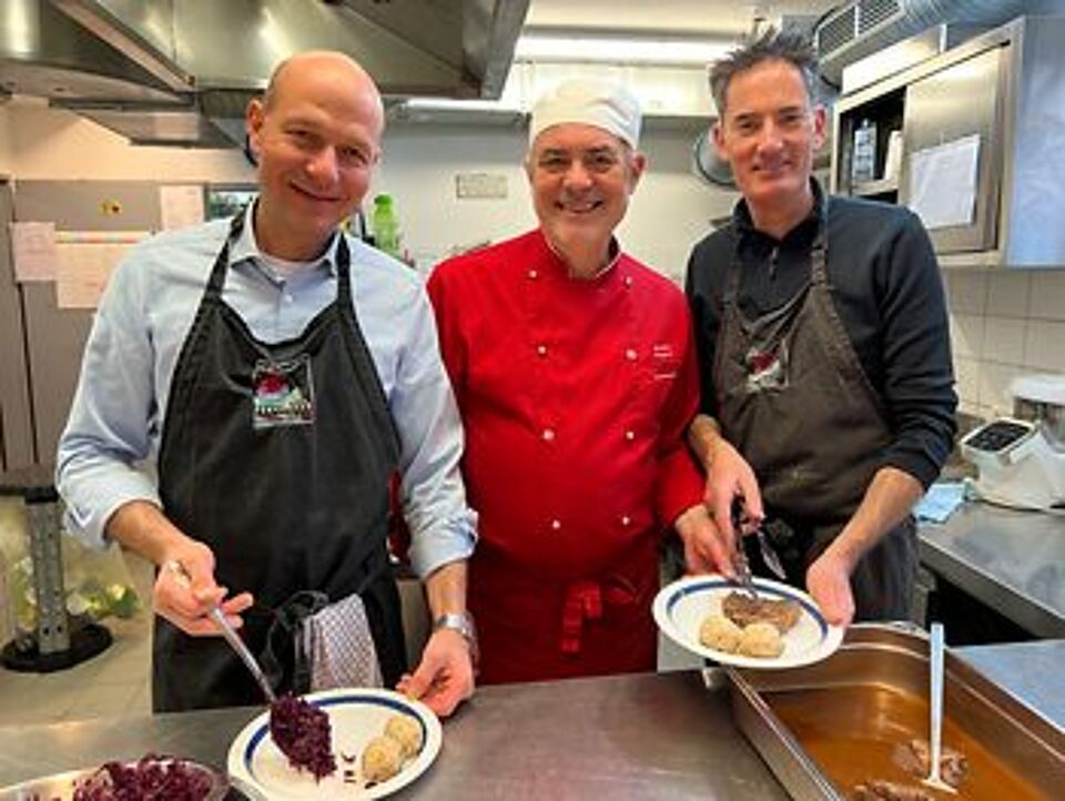 Die Drei bereiteten ein köstliches Mittagessen aus Sauerbraten mit selbstgemachten Semmelknödeln und Blaukraut zu. Als Nachspeise wurde eine Crème mit Pfirsichen serviert. Das gesamte Menü war für die Gäste kostenlos. Im Anschluss an die Aktion nutzte das Trio die Gelegenheit, um mit den Besucherinnen und Besuchern ins Gespräch zu kommen. „Die Wärmestube war sehr gut besucht. Wir konnten ca. 70 Portionen ausgeben“, berichtet Katrin Wassermann, die Leiterin der Wärmestube mit Übernachtungsstelle. „Alle haben sich sehr gefreut und das vorzügliche Essen und auch die Gespräche genossen.“ Auch den Köchen machte die Arbeit offenbar Spaß. Der nächste Termin der gemeinsamen Aktion ist bereits in Planung.