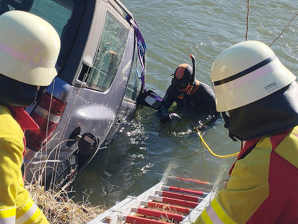 Bei der anschließenden Bergung des Wagens, der mit einem Schneepflug ausgestattet war und über keine amtlichen Kennzeichen verfügte, leistete die Wasserwacht ebenfalls tatkräftige Hilfe. Ein Mitglied befestigte unter Wasser die Gurte des Autokrans an den Vorderrädern, sodass der Abschleppdienst das Fahrzeug aus den Fluten hieven konnte. Die Freiwillige Feuerwehr Hegge unterstützte die Aktion. Nach gut dreieinhalb Stunden war der Einsatz für die beteiligten Kräfte von Polizei, Feuerwehr und Wasserwacht beendet. Über die Hintergründe des Vorfalls ermittelt die Polizei.