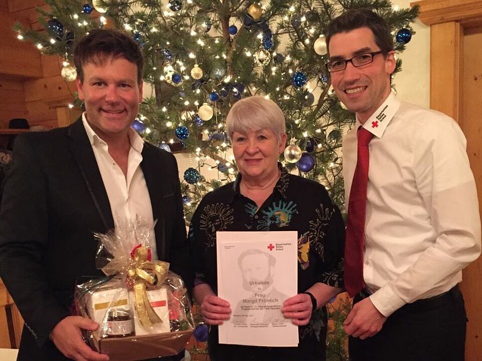 Anfangs war sie selbst auf Hilfe angewiesen, mittlerweile trägt Margit Fröhlich seit zehn Jahren dazu bei, dass in der Tafel Kempten des BRK Oberallgäu bedürftige Menschen mit Lebensmitteln versorgt werden. Für ihr langjähriges ehrenamtliches Engagement wurde Ewalda Fröhlich, genannt Margit, nun von Christian Holzer, stellvertretender Vorsitzender des BRK Kreisverbands Oberallgäu, und Tafel-Koordinator Markus Wille mit einer Urkunde ausgezeichnet. Als Dankeschön wurde ihr außerdem ein Präsentkorb mit kleinen Leckereien überreicht.