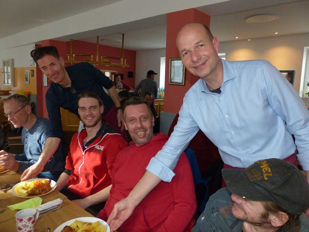 Am Donnerstag schwangen Kemptens Oberbürgermeister Thomas Kiechle, Sozialreferent Thomas Baier-Regnéry und BRK-Kreisgeschäftsführer Alexander Schwägerl gemeinsam in der Wärmestube des BRK die Kochlöffel. Die Drei bereiteten eine Brätknödelsuppe, Hähnchenschenkel mit Salzkartoffeln, Rosenkohl und Karottengemüse sowie einen Apfelstrudel mit Vanillesoße und Eis zu. Zahlreiche Gäste wollten sich selbst einen Eindruck von den kulinarischen Fähigkeiten der Amtsträger machen, so war die Wärmestube war mit 80 Personen bis auf den letzten Platz besetzt. Im Anschluss durften die Akteure viel Lob für ihre Kochkünste entgegennehmen. Die Stadt Kempten sponserte die Lebensmittel, sodass das Menü für die Gäste kostenlos angeboten werden konnte.