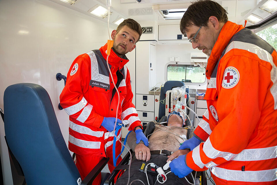 - bei Bewusstlosigkeit und fehlender normaler Atmung: sofort Herz- Lungen-Wiederbelebung, Atemspende bis zum Eintreffen des Rettungsdienstes
