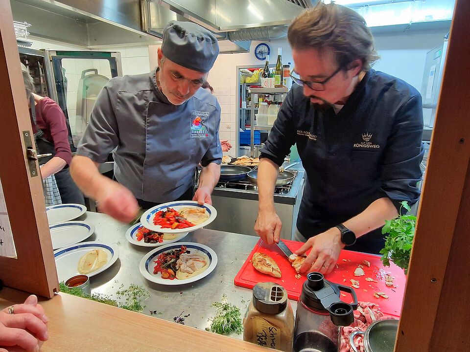Gemeinsam mit BRK-Kreisgeschäftsführer Alexander Schwägerl, der regelmäßig ehrenamtlich in der Wärmestube kocht, sowie mehreren Helferinnen und Helfern stand Gremm am Herd in der Küche der Wärmestube. Das Team bereitete ein Menü zu, das augenzwinkernd auf Gremms Bühnenrollen anspielte: Zum Auftakt wurde eine „Vampirsuppe“ aus roter Bete serviert, begleitet von Jakobsmuschel und garniert mit einem Holzpflock – eine Reminiszenz an das Musical „Tanz der Vampire“. Es folgten sous-vide gegarte Hähnchenbruststreifen auf einem „Bett aus 1001 Nacht“, und als Dessert ein Baiser mit Sahne und Frühsommerbeeren.