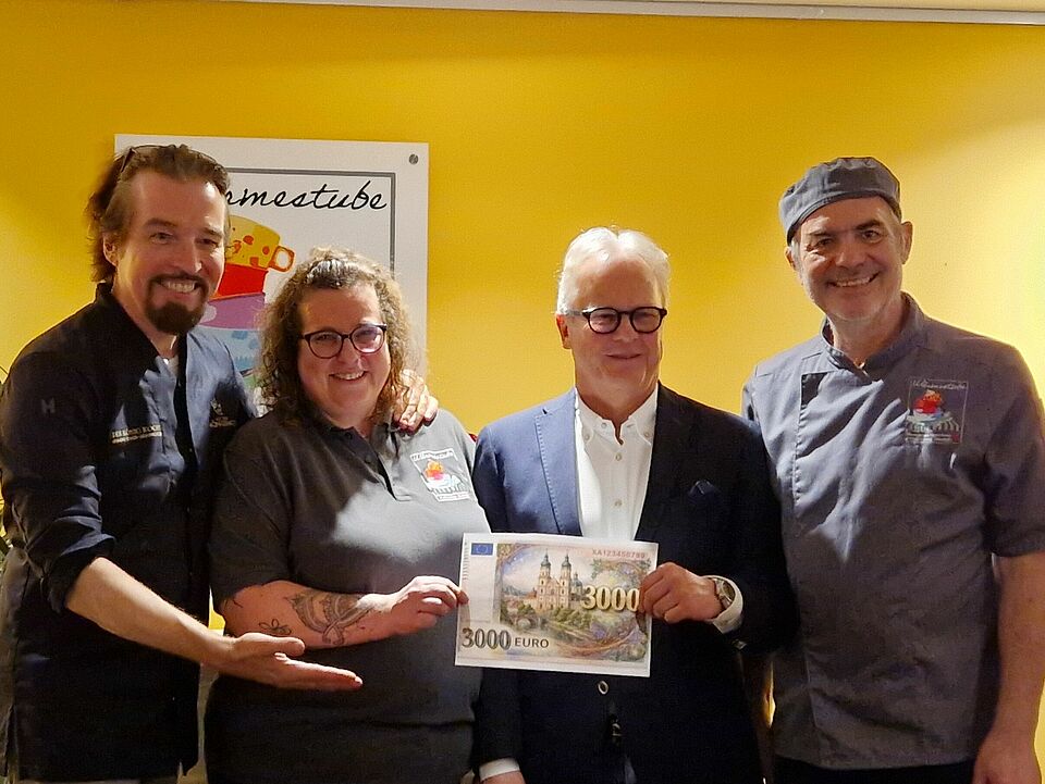 Rund 50 Gäste folgten der Einladung zu der Veranstaltung, deren Erlös dem Betrieb der Wärmestube zugutekommt. An den festlich, beinahe „königlich“ eingedeckten Tischen versammelten sich Privatleute, Firmeninhaber sowie Mitglieder der örtlichen Serviceclubs Lions und Rotary. Die Teilnahme erfolgte nach vorheriger Anmeldung; die Gäste entrichteten ihren Spendenbetrag im Vorfeld oder im Laufe des Abends. Frank Richter, der anlässlich seines Geburtstags gesammelt hatte, überreichte 3.000 Euro symbolisch in Form eines gedruckten Geldscheins. Unterstützt wurde der Abend auch durch Sachspenden: Das Fleisch stellte die Metzgerei Rauch aus Waltenhofen zur Verfügung, die Jakobsmuscheln kamen vom Altusrieder Fisch- und Wildspezialitäten-Händler „Der Schmidt“.